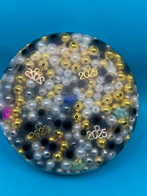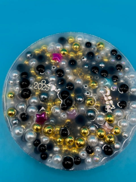 Picking Pads are an excellent way to soothe anxiety, ease fidgeting, and calm skin and hair picking. They are a great way to pass the time for children and adults just the same. They are great for waiting rooms, doctor's offices, and other places where you may need to pass the time. This classic black, white and gold 2025 New Year's charm picky pad is the perfect way to choose not to fidget or pick at your skin/hair (often known as Dermatillomania).
